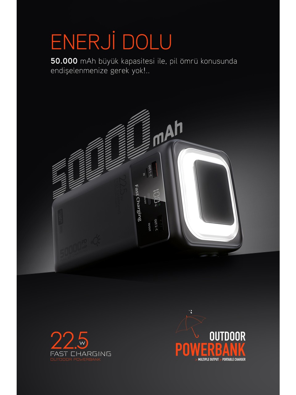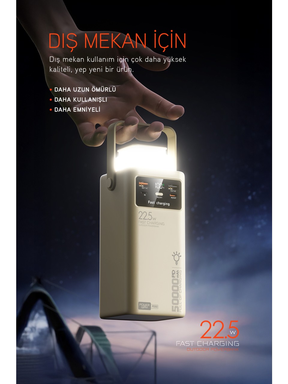 ✨ 50.000 mAh kapasite + PD hızlı şarj + dahili kablolar + LED fener = tam kamp ve acil durum güç çözümü! 🚀
